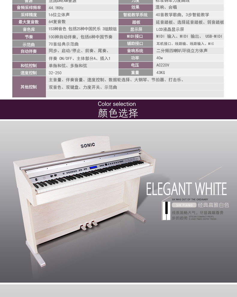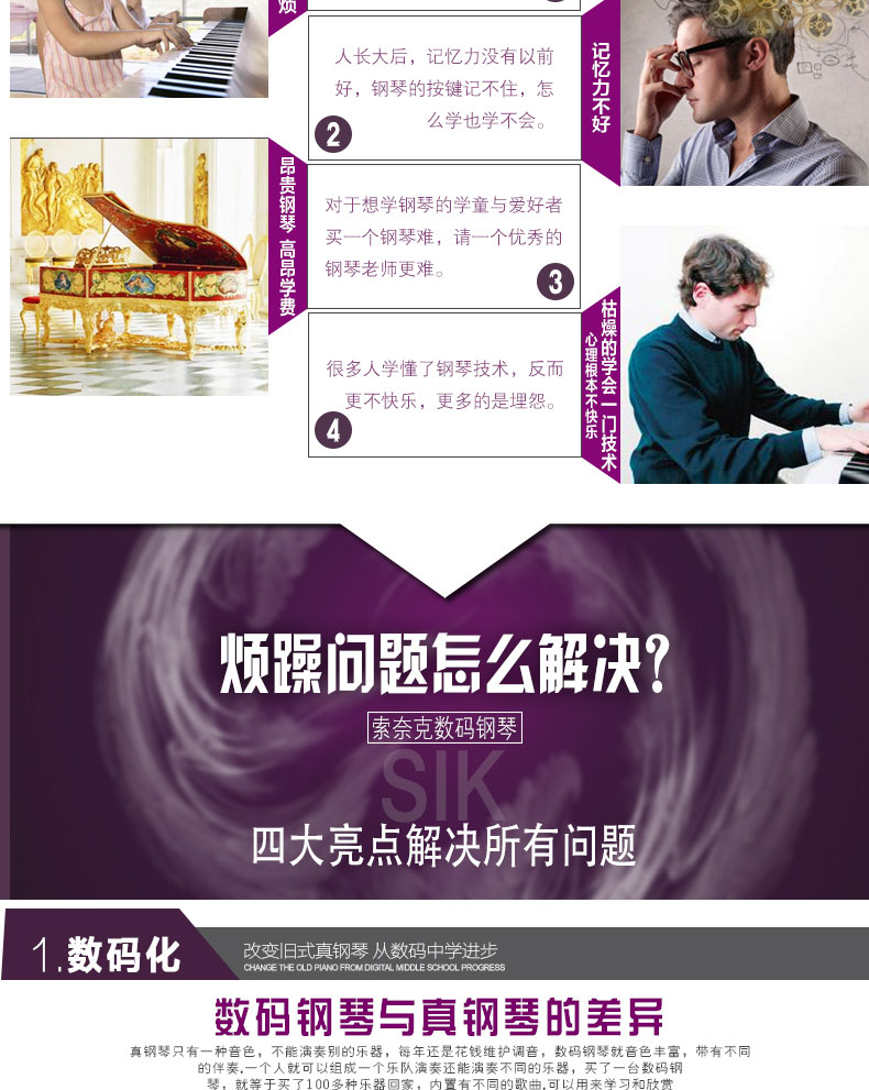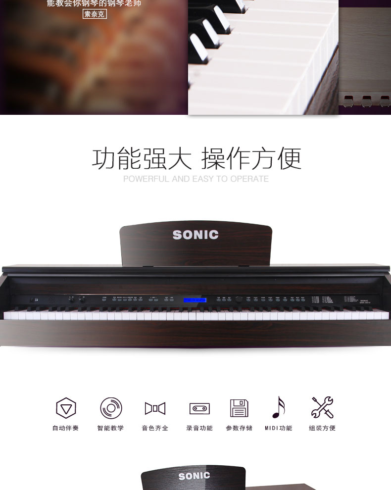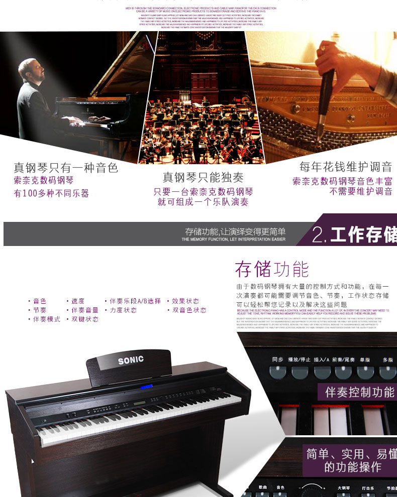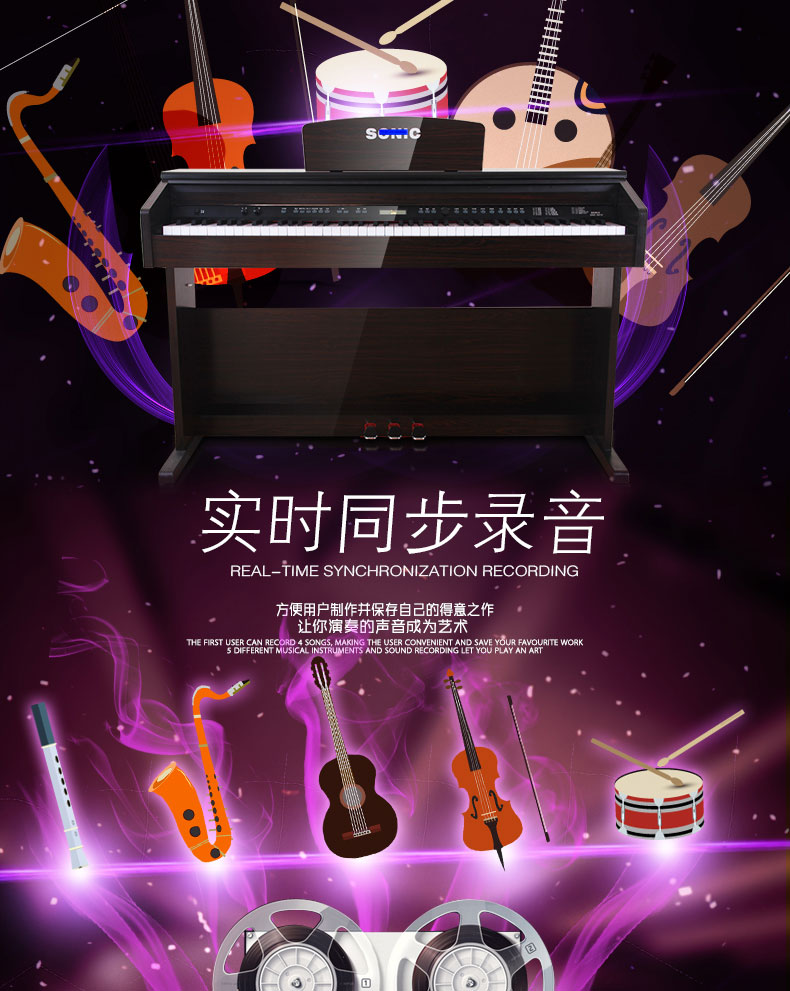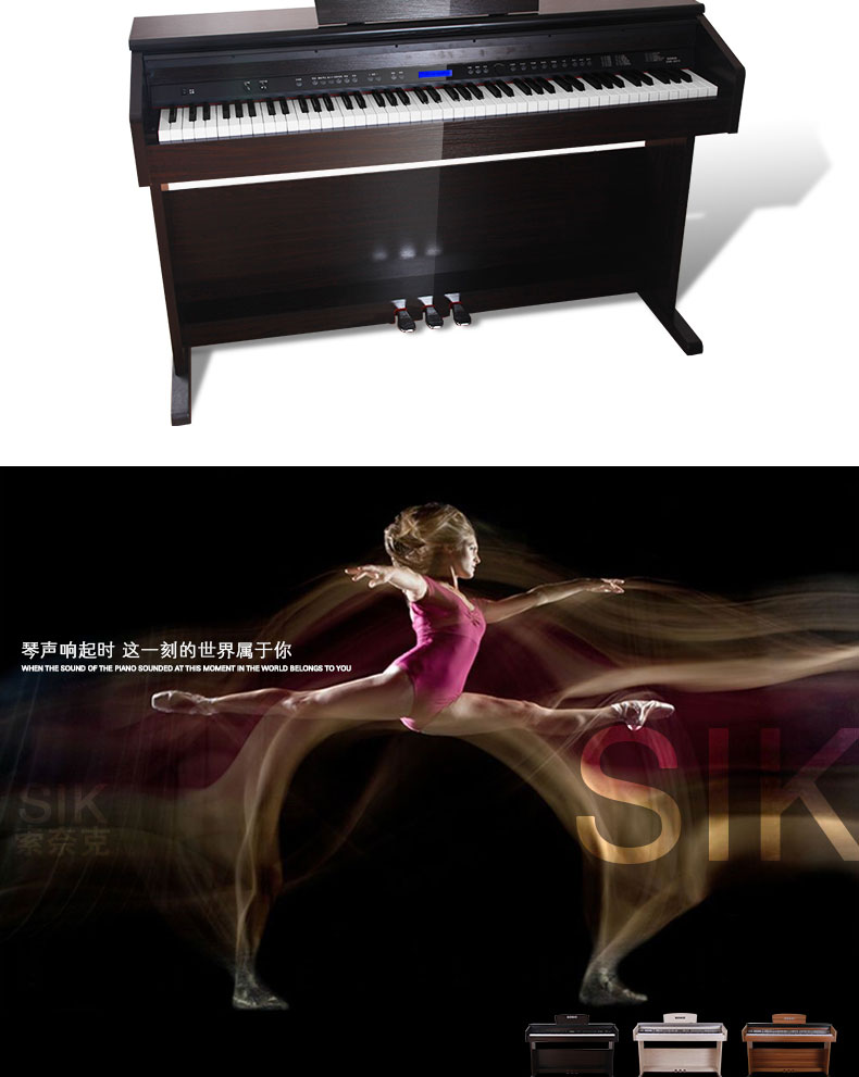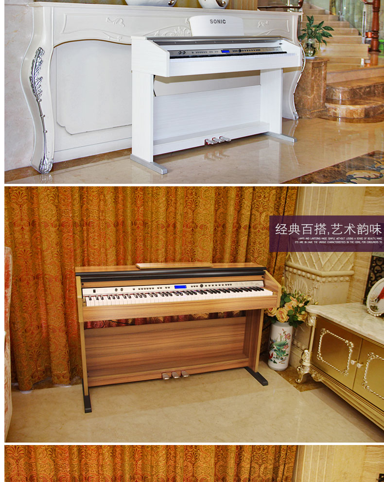 鋼琴號稱樂器之王。在世界音樂的寶庫之中,鋼琴的作品可以說是最豐富的,鋼琴要完成這些作品的演奏當然是沒有任何問題的。現在市場上的電鋼琴也都是88個標準鋼琴鍵盤,同樣可以彈奏這些鋼琴曲目。除此以外電鋼琴還兼有電子琴乃至合成器的功能,有很多音色和節奏可以選擇,還可以很方便地移調,這尤其對于鋼琴演奏水平不是很高的人來說是非常方便實用的,同時也大大增強了它的娛樂性。電鋼琴還可以戴著耳機練琴,這對于初學者、半夜里想抒發一下感情的音樂愛好者、靈感突然爆發的專業人士來說不用再擔心打擾他人,電鋼琴都有MIDI接口,可以非常方便地跟電腦進行連接,這也使電鋼琴的功能得到較多的擴展。由于電鋼琴是電子產品,它的功能還有很多,這里就不一一敘述了。總的來說一臺好的電鋼琴不僅能滿足鋼琴作品的演奏而且在某種意義上來說可以代替一只樂隊,這就是電鋼琴被很多音樂工作者廣泛使用的原因,而這些功能鋼琴沒有也不可能具備。