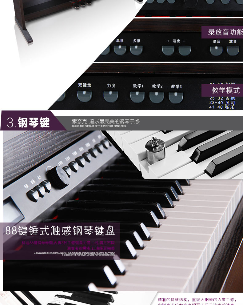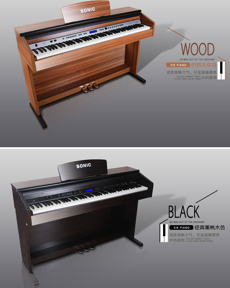 由于生產成本、技術資源、市場策略等原因,市場上的電鋼琴有著很多不同。有一些電鋼琴只能說是加寬的電子琴,這種電鋼琴雖然也是88個標準鋼琴鍵盤,也有力度健可以選擇,我們把這類電鋼琴當成電子琴使用也很不錯,而且性價比很好,畢竟是88健個標準鋼琴鍵盤,這是幾乎所有電子琴都沒有的。但是如果用這樣的電鋼琴當作鋼琴用就顯然不行,它會使練琴的人養成很多不良習慣,以后糾正起來也非常困難。因為這樣的電鋼琴在彈奏中手指觸健的力度反應非常不明顯,換句話說“摸”它一下和“彈”它一下沒有太大的區別,這種缺點的存在使得電鋼琴引起了很多人的偏見,包括我們一些對新技術、新產品不太了解的音樂教師,認為所有的電鋼琴都是這樣,跟鋼琴根本無法比,更不用說代替鋼琴了。